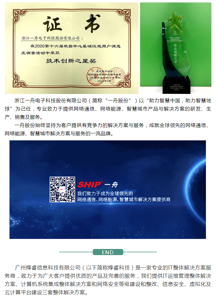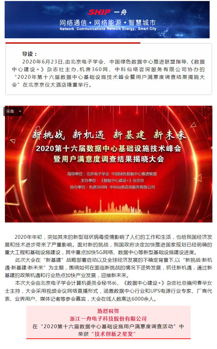 一舟荣誉丨一舟在“2020第十六届数据中心基础设施用户满意度调查活动” 荣获“技术创新之星奖”
